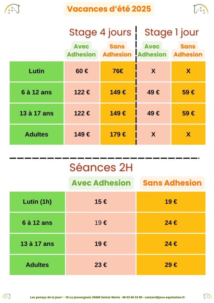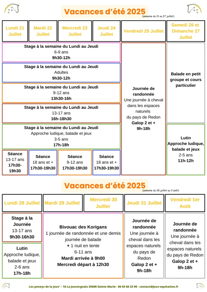 Programme été 2025Ferme Equestre les poneys de la JouvProgramme - Semaine du 7 au 20 Juillet 2025 Programme - Semaine du 27 Juillet au 1er Août 2025 Programme - Semaine du 4 au 17 Août 2025 Accéder aux activités Accéder au formulaire d'inscription Les Tarifs Accéder aux activités Accéder au formulaire d'inscription
